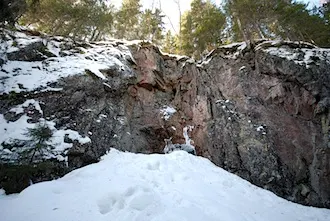 Jääseinän vastapäätä on rouheaa graniittia. Kapuan luminyppylän päälle, kallion juurelle, mistä löytyvän luolan suuaukko on nyt jään peitossa. Tänne asti kuuluu rotkon toiselta puolelta jään takana lorisevan veden ääni.