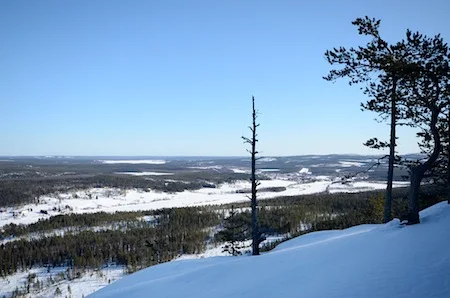 Oi Aavasaksa ja Ylitornion heleän sininen kevättalven taivas! Aavasaksa ja Tornionjokilaakso on nimetty yhdeksi Suomen 27:stä kansallismaisemasta, joten luvassa on ihan virallisesti merkittäväksi tunnustettu elämys. Tallustan ylämäkeen Aavasaksan huipulle johtavaa tietä lumikengät kainalossa ja päätän siirtyä heti Kruununpuiston puolelle astuttuani tieltä sivuun, tutustumaan maastoon Kruununkierrokseksi merkittyä reittiä pitkin, vastapäivään.