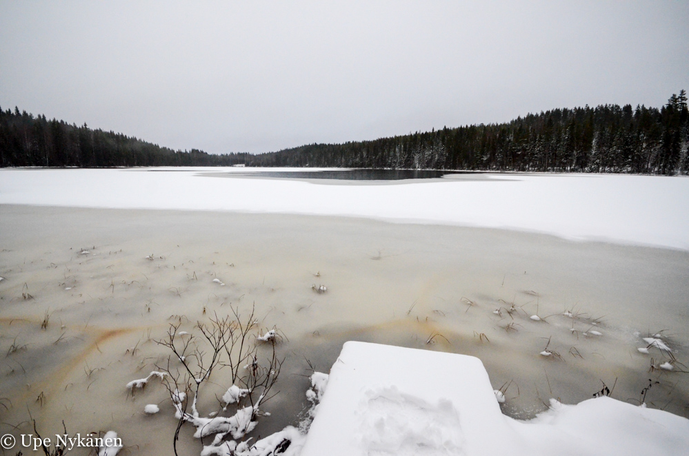 Matkamme jatkui vielä tovin pikkutietä ylämäkeen, sitten käännyimme tieltä vasemmalle, laskeutumaan kohti Isoa Häähninjärveä. Metsä oli jalkojen alla märkää, joskin vähälumista. Koska kyseessä oli alas viettävä rinne, sai olla tarkkana, ettei jalka osunut valumavesistä täyttyneeseen uomaan tai kuoppaan. Pian olimme kuitenkin päässeet turvallisesti alas Ison Häähninjärven rantaan ja seurasimme kapeaa polkua järven eteläpäätä kohti.